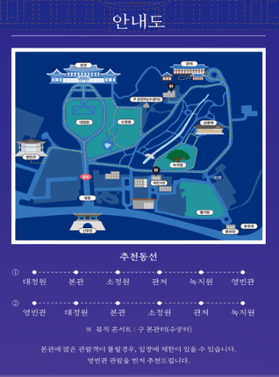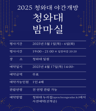 특히 야간 개방행사인 '청와대 밤마실'은 일년 중 일주일만 진행되는 행사인만큼 빠르게 마감됩니다. 늦기 전에 서둘러 예약해 야간의 멋진 청와대 모습을 보시기 추천드립니다.